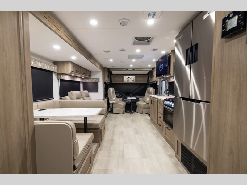 Sleeps 8 Slides 2 Length 31 ft 11 in Ext Width 8 ft 5 in Ext Height 12 ft 5 in Int Height 7 ft Interior Color Seaport Storm, Mink Exterior Color Pearl Grey Hitch Weight 5000 lbs GVWR 22000 lbs Fresh Water Capacity 50 gals Grey Water Capacity 42 gals Black Water Capacity 42 gals Tire Size 245/70R19.5 Furnace BTU 35000 btu Generator 6 KW NPS Yamaha Fuel Type Gas Engine 7.3L V8 Chassis Ford F53 Horsepower 335 hp Fuel Capacity 80 gals Wheelbase 228 in Number Of Bunks 1 Available Beds King Torque 468 ft-lb Refrigerator Type 12V Three Door Refrigerator Size 15 cu ft Cooktop Burners 3 Shower Size 36" x 30" Number of Awnings 1 Axle Weight Front 8000 lbs Axle Weight Rear 15000 lbs LP Tank Capacity 103 lbs Water Heater Capacity 6 gal Water Heater Type Gas/Electric AC BTU 28500 btu Basement Storage 115 cu. ft. TV Info LR 40" Flip-Up LED 12V TV, BR 32" Flip-Up LED 12V TV, Ext. 32" LED 12V TV Awning Info 16' Power with LED Light Washer/Dryer Available Yes Gross Combined Weight 26000 lbs Shower Type Standard Electrical Service 50 amp Similar Floorplans