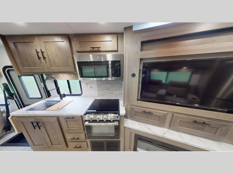 Each FR3 is built on a Ford F53 chassis with a 7.3L V8 six-speed TorqShift transmission giving you 335HP to power your many adventures. A few other outstanding features include the body-mounted side and rearview camera package, a one-piece fiberglass roof, a grey Rotocast storage boxes with drains, and a 5,000-lb. tow hitch. The interior is just as impressive with 84" interior ceilings, IVC residential vinyl flooring, custom countertops with flip-up and pullout countertop extensions, and a residential microwave to mention a few highlights.