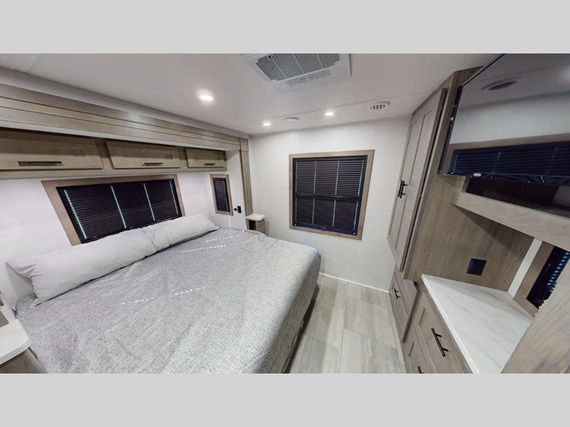 The vacuum bonded construction means you can enjoy traveling in this coach for years to come, and there is a SUPER STORAGE pass-through rear cargo compartment so nothing gets left behind. You'll love the flush floor construction inside with no steps into the cockpit, and there are 7' interior ceilings that will have your space feeling more like home. Some of the systems you'll find convenient are the hydraulic 4-point auto leveling jacks, Go Power solar panels, and a Forest River command center to easily manage your coach's functions.