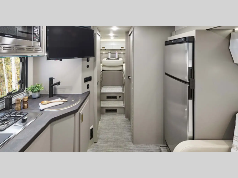 Sleeps 3 Slides 1 Length 25 ft 8 in Ext Width 7 ft 7 in Ext Height 10 ft 7 in Int Height 6 ft 8 in Interior Color Hygge Haus ll, Mod Allure ll Exterior Color Dune Frost, Misty Lake, Precious Metals, Smokehouse Hitch Weight 5000 lbs GVWR 11030 lbs Fresh Water Capacity 30 gals Grey Water Capacity 46 gals Black Water Capacity 47 gals Furnace BTU 25000 btu Fuel Type Diesel Engine 2.0L High Output Turbo Diesel 4-Cylinder Chassis Mercedes-Benz RWD Sprinter Fuel Capacity 24.5 gals Wheelbase 170 in Number Of Bunks 1 Available Beds Murphy Refrigerator Type 12V Two Door Compressor Driven Refrigerator Size 10 cu ft Convection Cooking Yes Cooktop Burners 2 Shower Size 30" x 34" Number of Awnings 1 Axle Weight Front 4410 lbs Axle Weight Rear 7720 lbs LP Tank Capacity 50.76 Water Heater Type Truma AquaGo Comfort Plus Tankless AC BTU 15000 btu Basement Storage 80.9 cu. ft. TV Info 32" LED HDTV Awning Info 16' Power with LED Lights & Bluetooth Control Gross Combined Weight 15250 lbs Shower Type Shower w/Seat Electrical Service 30 amp Similar Floorplans