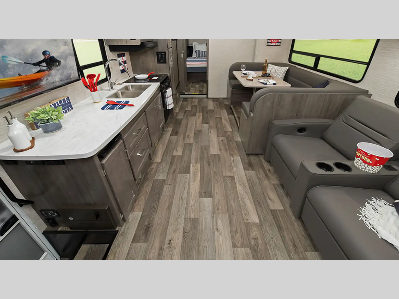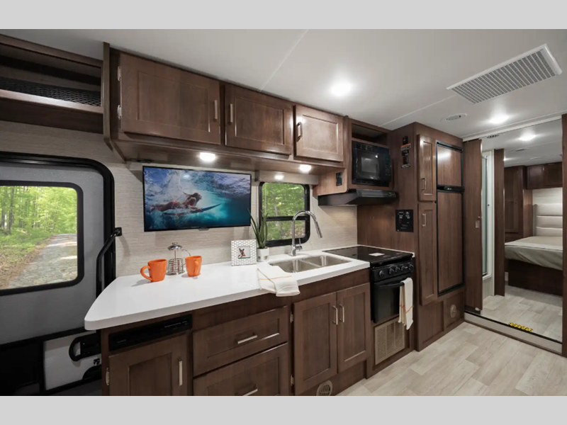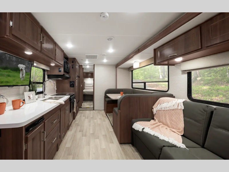 You can customize your coach with three decor options, whether you want a contemporary look or a cozy cabin feel. Each model includes a bedroom for the hosts and a cabover bunk for little ones, and there is even one model with bunk beds for added sleeping space. The fully-equipped kitchen is sure to grab your attention with Corian solid surface countertops, and the spacious bath ensures you'll never have to use the camp's facilities. A radio/rearview monitor system provides hassle-free maneuvering, and a 4,000-watt gas generator is included for your power needs.