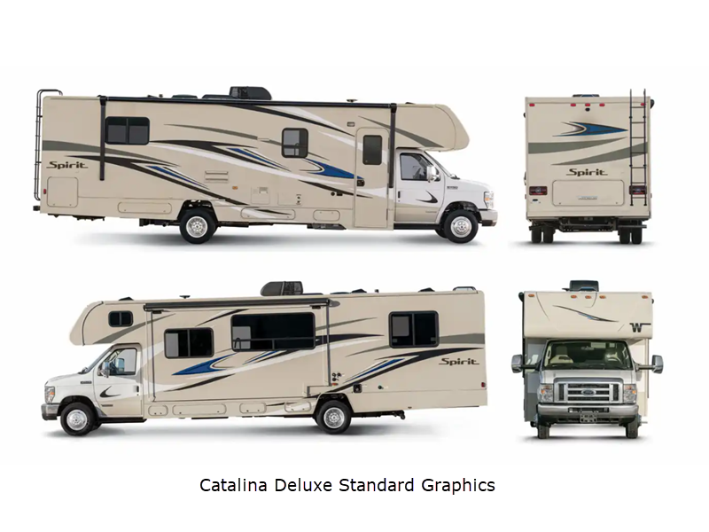 Sleeps 5 Length 23 ft 10 in Ext Width 8 ft 6 in Ext Height 11 ft Int Height 6 ft 10 in Interior Color Lennon w/Charcoal, Lennon w/Medium Gray, Starr Exterior Color Standard Graphics; Catalina Deluxe, Chestnut Deluxe, Full-Body Paint; Cool Mist, Suede Hitch Weight 7500 lbs GVWR 14500 lbs Fresh Water Capacity 40 gals Grey Water Capacity 24 gals Black Water Capacity 21 gals Furnace BTU 20000 btu Generator 4,000 Watt Gas Fuel Type Gasoline Engine Premium 7.3L V8 Chassis Ford E450 Horsepower 350 hp Fuel Capacity 55 gals Wheelbase 158 in Number Of Bunks 1 Available Beds Double Refrigerator Type Two Way Double Door Refrigerator Size 6.3 cu ft Cooktop Burners 3 Shower Size 23" x 34" Number of Awnings 1 Axle Weight Front 5000 lbs Axle Weight Rear 9600 lbs LP Tank Capacity 76.14 lbs Water Heater Capacity 6 gal Water Heater Type LP with Electronic Ignition AC BTU 15000 btu Basement Storage 60.4 cu. ft. TV Info LR 32" HDTV, BR 24" HDTV Awning Info 14' Power with LED Lighting Gross Combined Weight 22000 lbs Shower Type Standard Electrical Service 30 amp Similar Floorplans